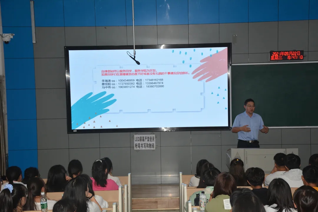 9月22日晚上,为培养2021级新生自律意识,养成良好自律品格。bat365官网登录入口于第一教学楼1-1开展了自律大会,出席此会议的有学生负责人,bat365官网登录入口学生会自律部以及2021级全体新生。