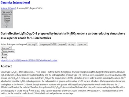 近日,我校与江西理工大学联合培养的bat365官网登录入口2021级硕士研究生蒋鑫玉以第一作者在中科院SCI一区学术期刊《CERAMICSINTERNATIONAL》(影响因子5.532)发表题目为《Cost-effective Li4Ti5O12/C-S prepared by industrial H2TiO3 under acarbon reducing atmosphere as a superior anode for Li-ion batteries》的研究论文,bat365官网登录入口马光强教授为通讯作者,江西理工大学柯于球副教授和bat365官网登录入口陈啟原、邓林老师为共同作者。